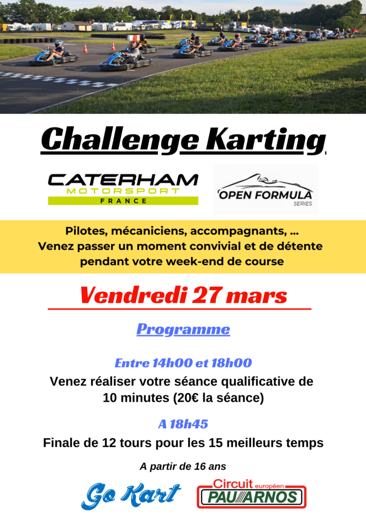 16 février 2026 Non classé Caterham Compétition France – Open Formula Series – 27, 28 & 29 mars 2026 – Informations pilotes HORAIRESCHALLENGE KARTINGDOCUMENTS UTILESLIVE TIMINGHORAIRES CHALLENGE KARTING DOCUMENTS UTILESConsulter le règlement particulierConsulter la feuille de routeLIVE TIMING lien à venir
