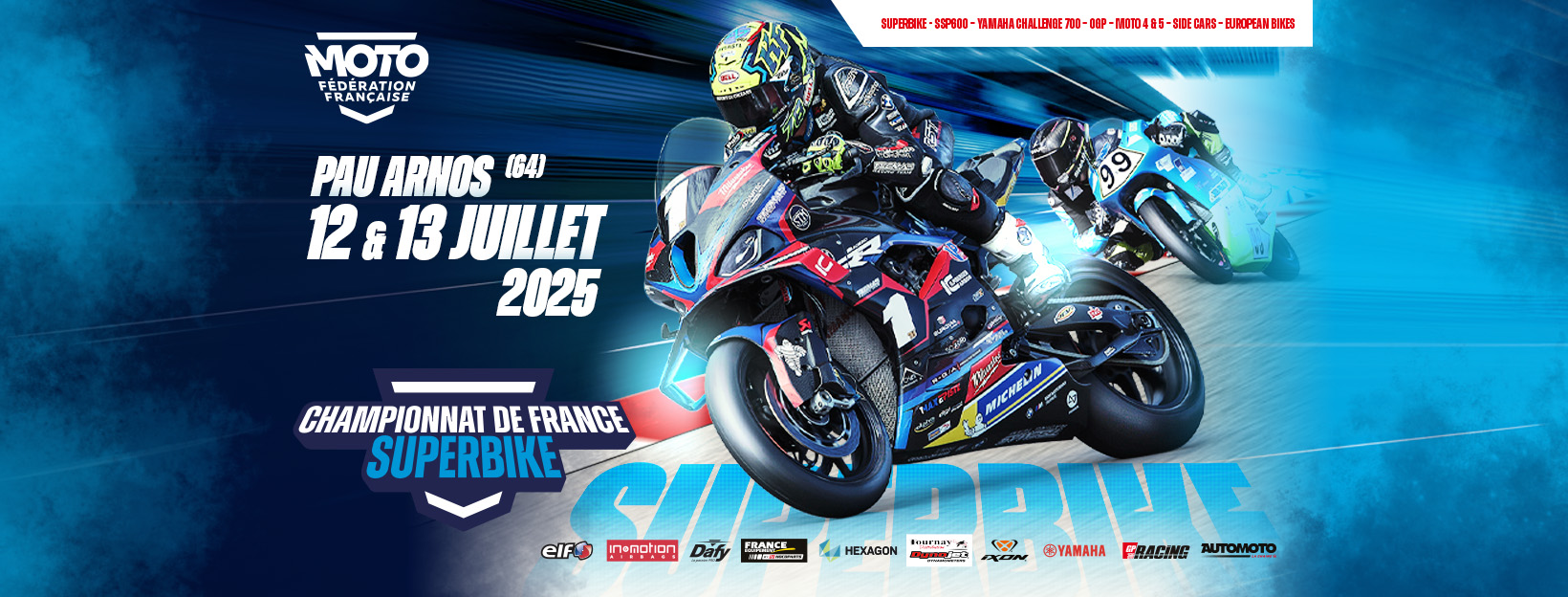 Nous vous informons que la manche béarnaise du Championnat de France Superbike initialement prévue sur le circuit les samedi 12, dimanche 13 et lundi 14 juillet 2025 aura finalement lieu les vendredi 11, samedi 12 et dimanche 13 juillet.