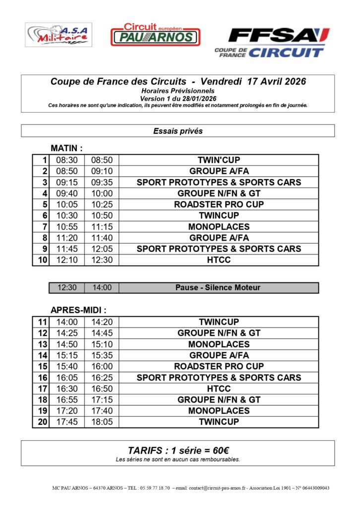 Vente des séries au bureau d’accueil du circuit le vendredi 17 avril dès 7h00
