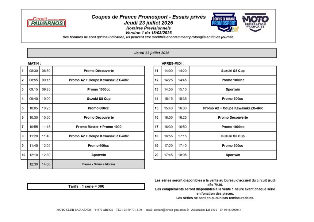 Vente des séries au bureau d’accueil du circuit le jeudi 23 juillet dès 7h30
